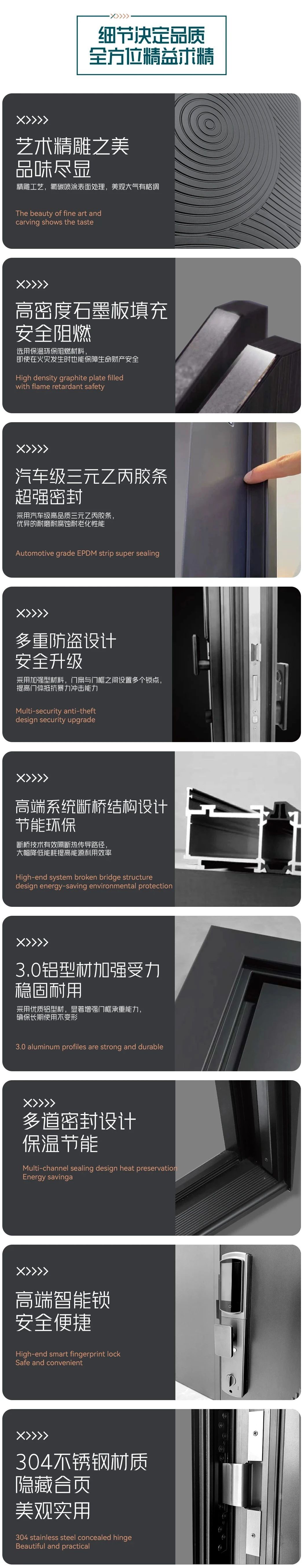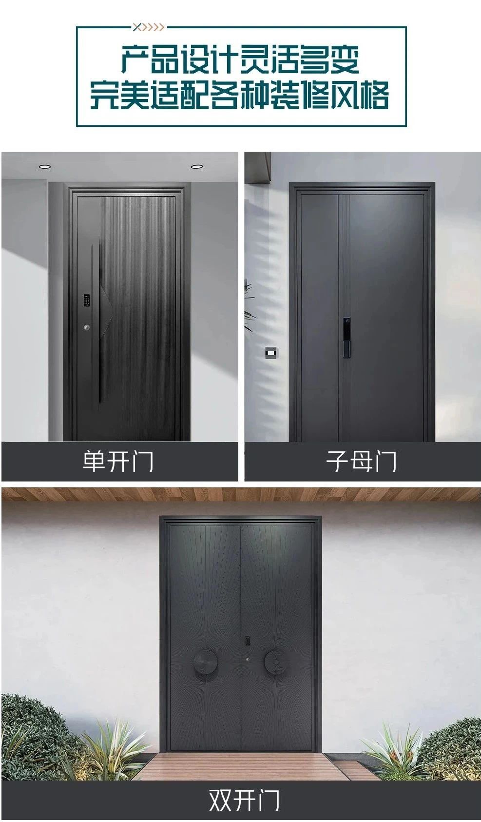 板材采用航空級品質 6063-T5 原生鋁,硬度高、韌性優、耐腐蝕性強。門扇承重好、安全性更高,使用壽命更長。除了一門一景,同時可做單開門、子母門和對開門等功能,為家庭創造更完美的空間體驗。智能安全鎖設計,防盜防撬性能加倍,擁有多重開啟方式,守護入戶門的第一道防線。