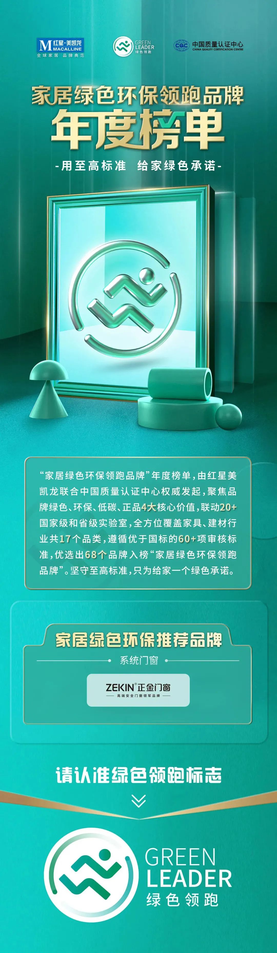 4月20日,由紅星美凱龍與中國質量認證中心(CQC)聯合發布的“家居綠色環保領跑品牌”年度榜單正式揭曉,正金門窗從眾多建材品牌脫穎而出,榮獲“家居綠色環保推薦品牌”認證。